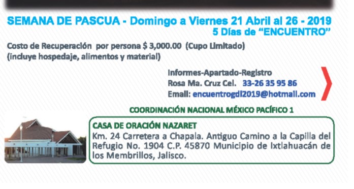 Venue: Casa de Oración Nazaret, Km. 24 a Chapala, antiguo camino a la Capilla del Refugio, No. 1894 CP 45870´.