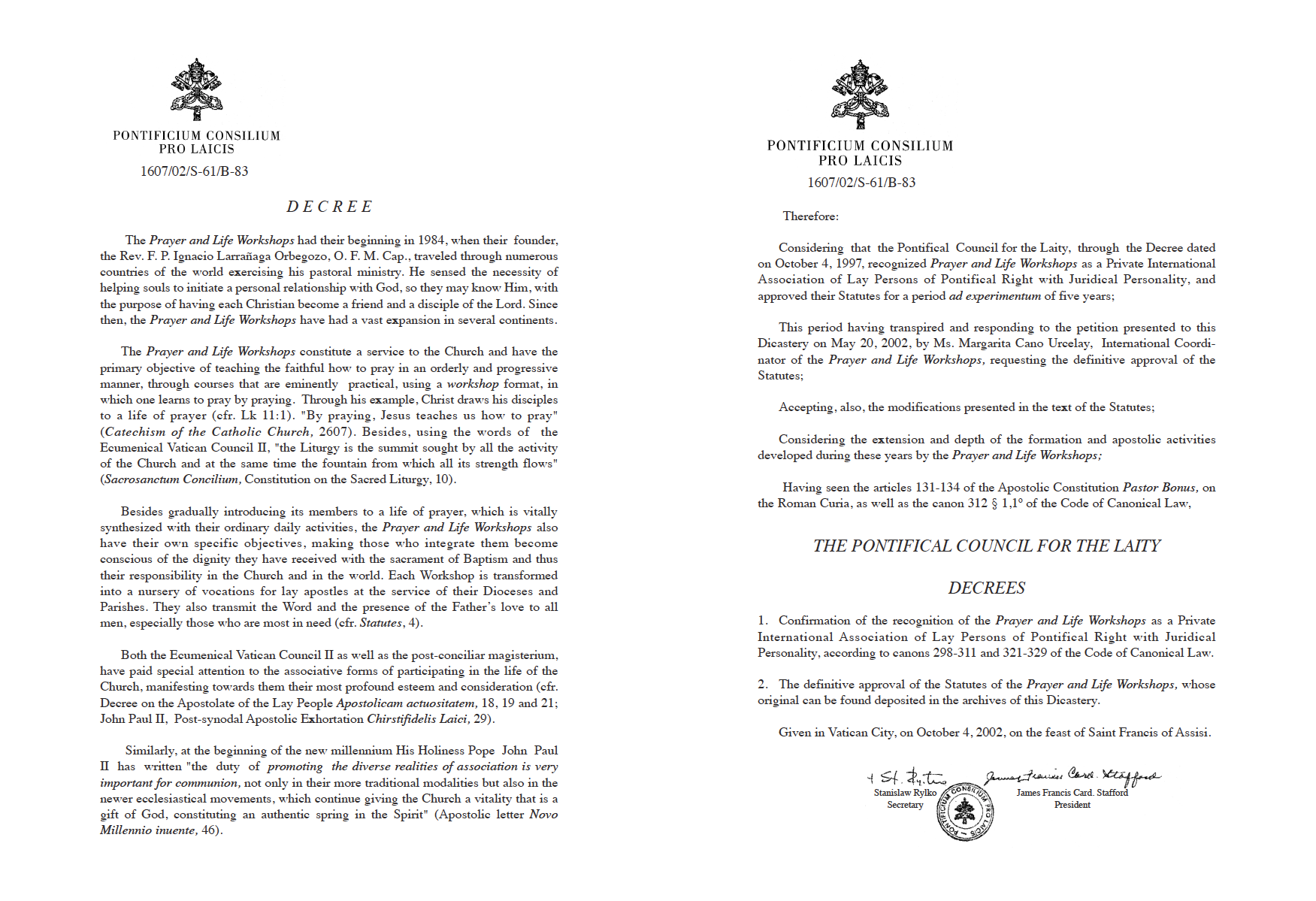 Considering that the Pontificial Council of Laymen, through the decree dated on October 4, 1997, recognized Prayer and Life Workshops as a Private International Association of Laymen, of Pontificial Law, with a Judicial Personality, and approved their Statutes for a period ad experimentum of five years.
